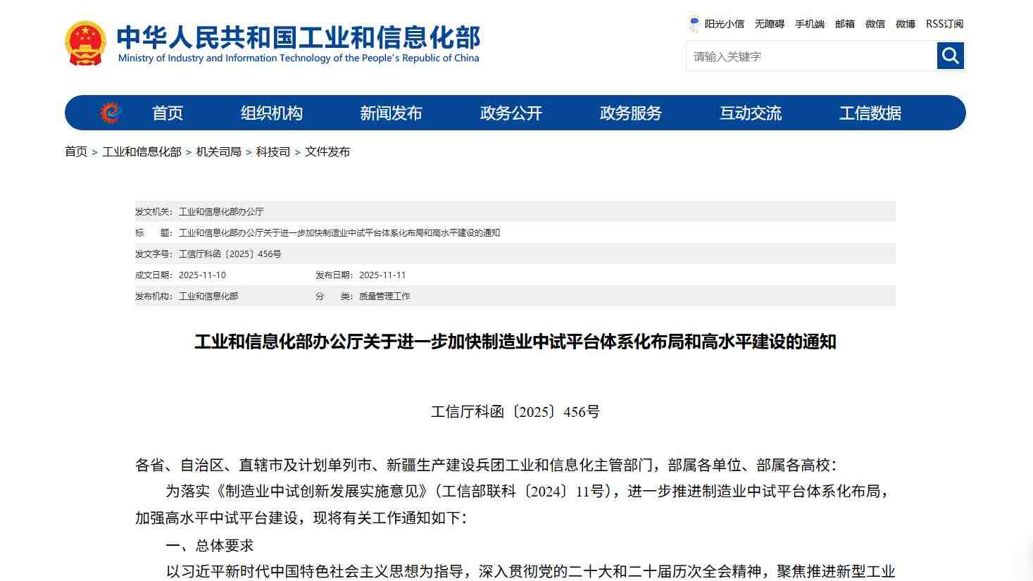 工业和信息化部办公厅关于进一步加快制造业中试平台体系化布局和高水平建设的通知