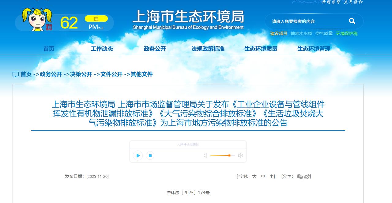 上海市生态环境局 上海市市场监督管理局关于发布《工业企业设备与管线组件挥发性有机物泄漏排放标准》《大气污染物综合排放标准》《生活垃圾焚烧大气污染物排放标准》为上海市地方污染物排放标准的公告