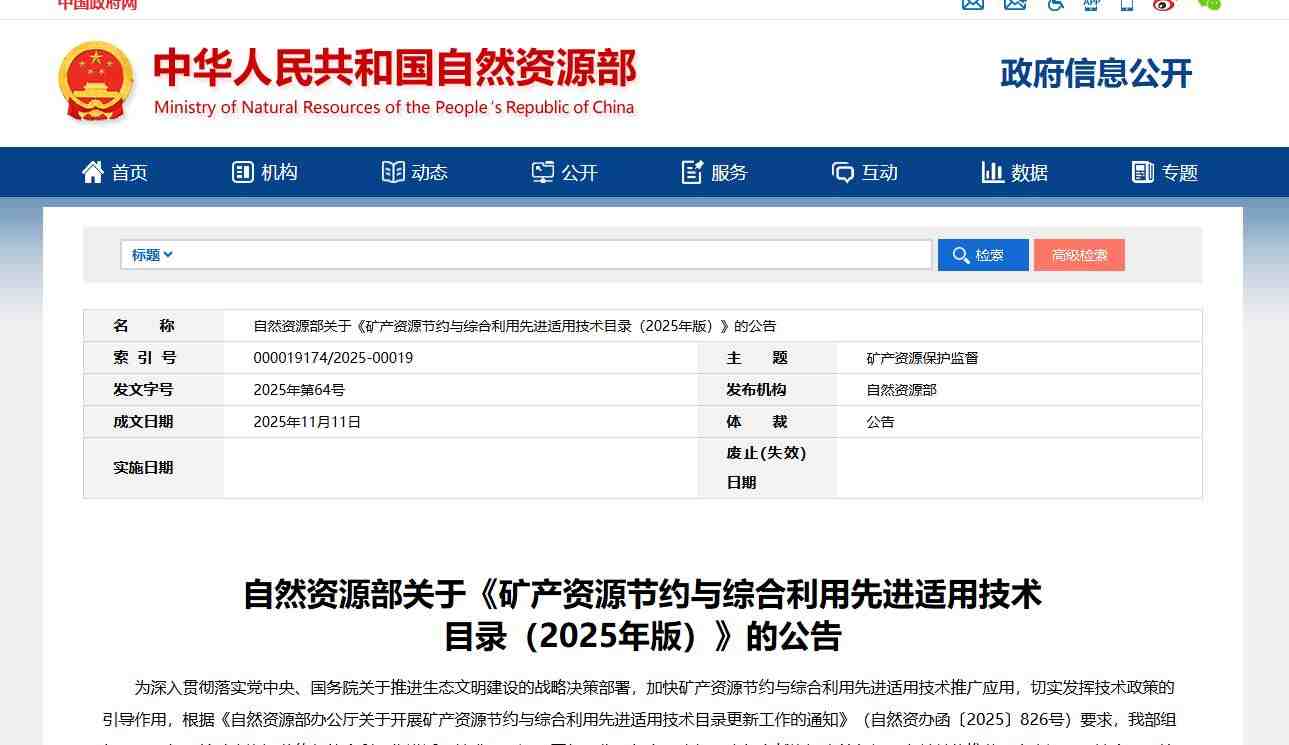 自然资源部关于《矿产资源节约与综合利用先进适用技术目录(2025年版)》的公告
