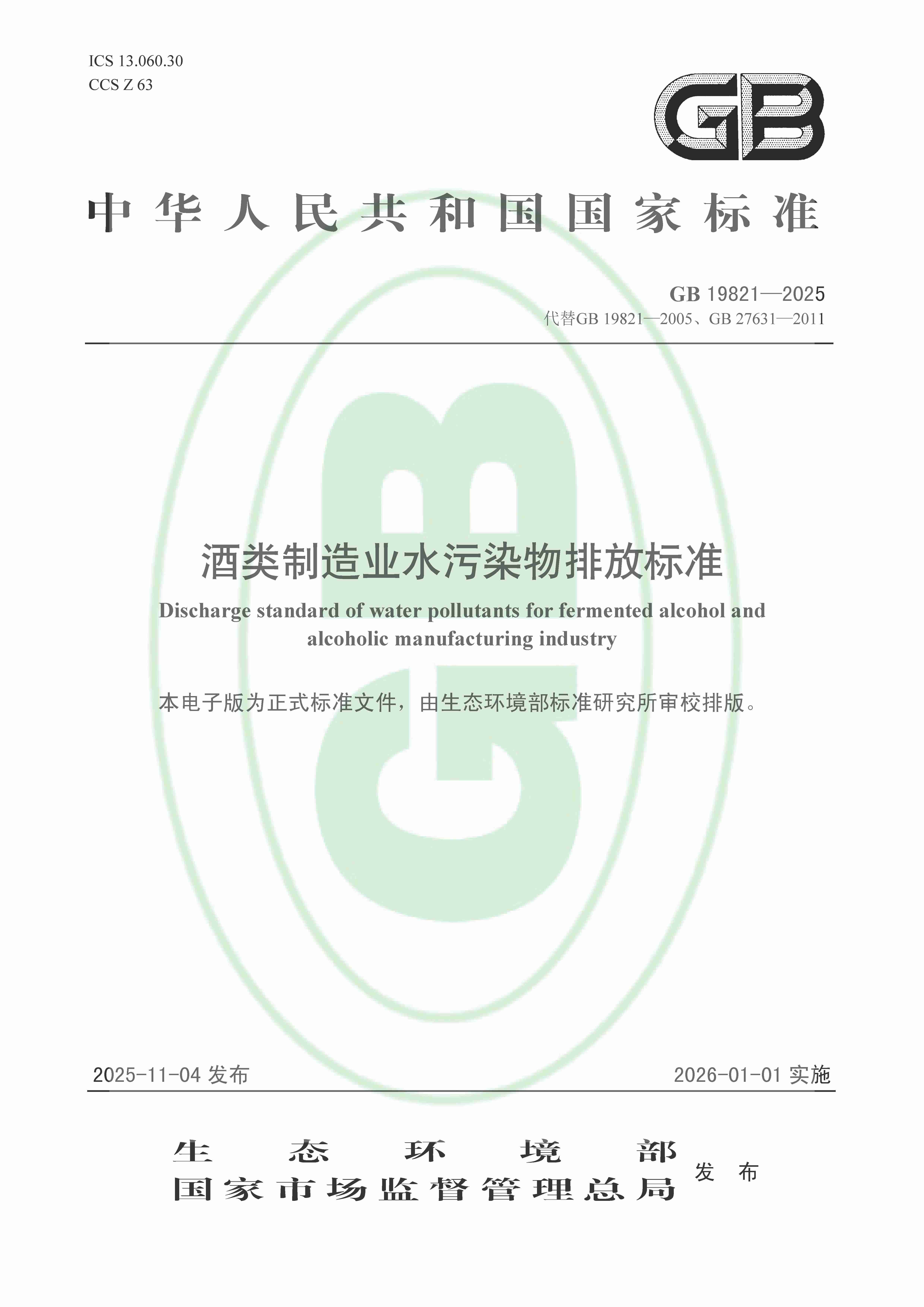 酒类制造业水污染物排放标准(GB 19821—2025代替GB 19821—2005、GB 27631—2011)